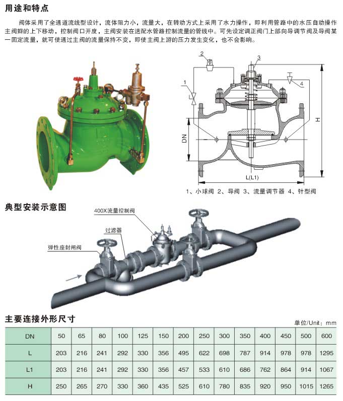 SF400X流量控制阀安装在配水管路需控制流量和压力的管路中,保持预定流量不变,将过大流量限制在一个预定值,将上游高压减为下游低压。即使主阀上游的压力发生变化,也不会影响主阀下游的流量。 SF400X流量控制阀技术参数: 压力等级:PN10、PN16、PN25 隔膜式:DN20~450 活塞式:DN500~700 介质温度:0~80℃ SF400X流量控制阀连接尺寸: